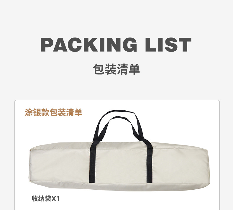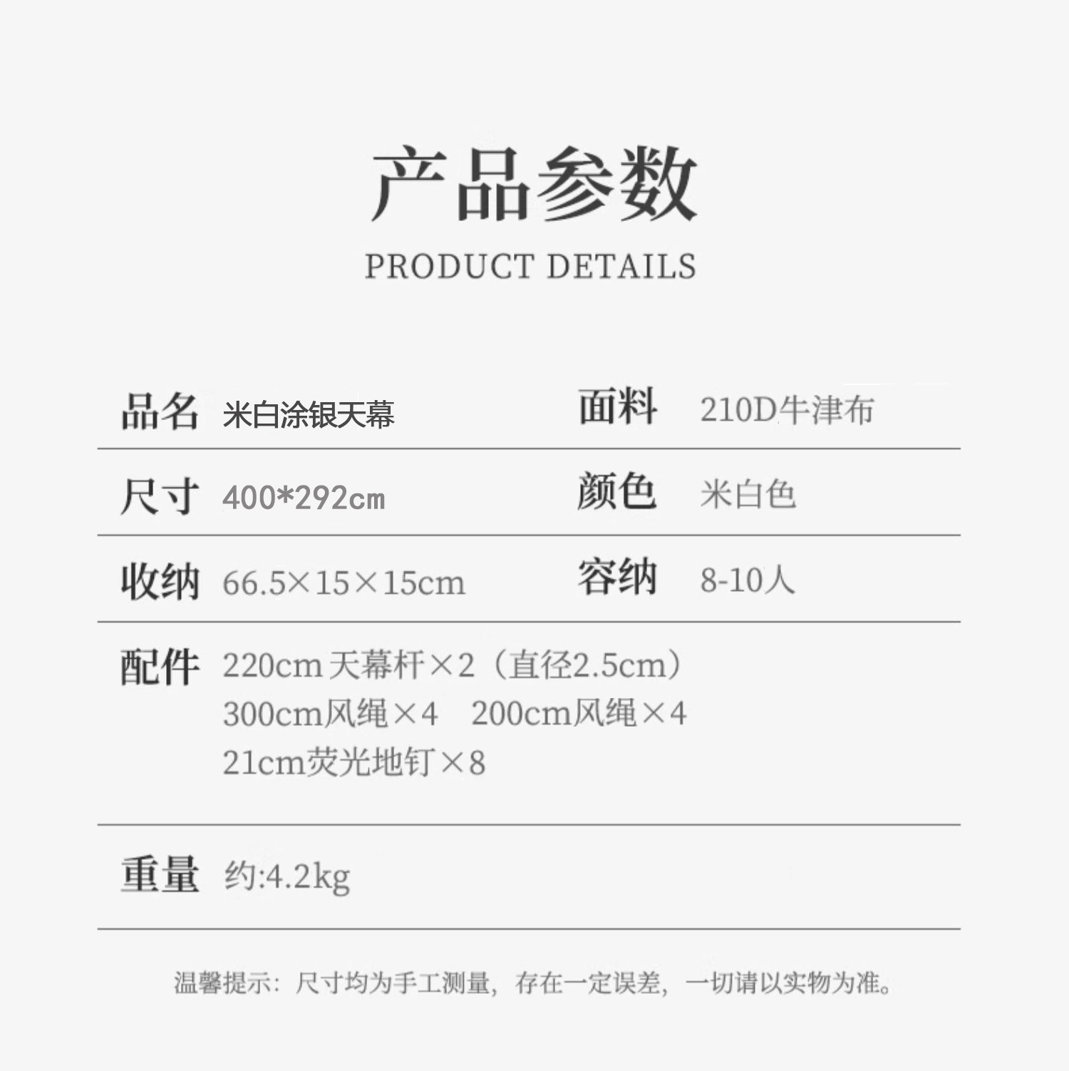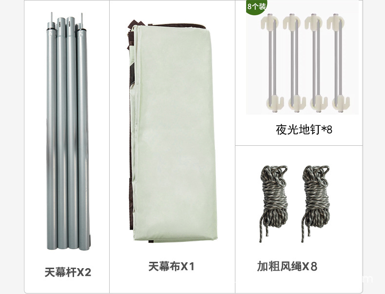 天幕杆2.5CM 直径,长2.2米两根,夜光地钉21CM 的8根,加粗风绳(米色或灰色)3米的4条,2米的4条,塑料风绳扣8个, 手提袋一只,杆子收纳袋一只。